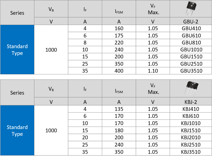 The GBU-2 / KBJ-2 series offers a 35A design, representing the industry’s highest current output available. All products use matte tin plating to extend shelf life and come in standard packaging, are halogen-free, and UL-certified, meeting regulatory and environmental requirements.